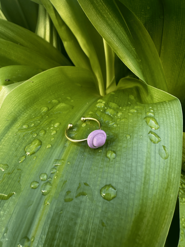Anel minimalista feito em grés decorado com vidrado lilás.