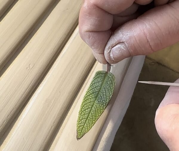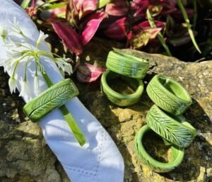 Argolas para guardanapos moldadas manualmente em grés com gravação de plantas naturais.