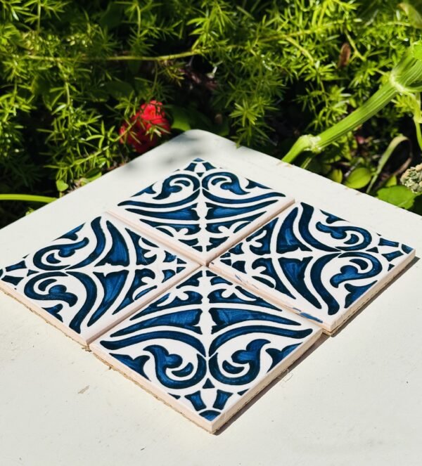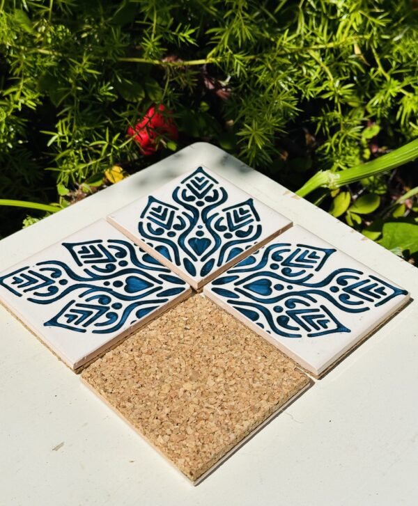 Bases de copos pintadas à mão em azulejo, revestidas com uma generosa camada de cortiça portuguesa. Vendido em pack de quatro unidades.