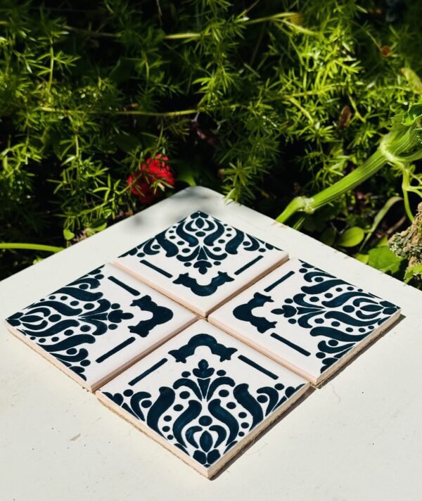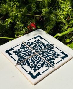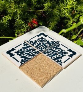 Bases de copos pintadas à mão em azulejo, revestidas com uma generosa camada de cortiça portuguesa. Vendido em pack de quatro unidades.