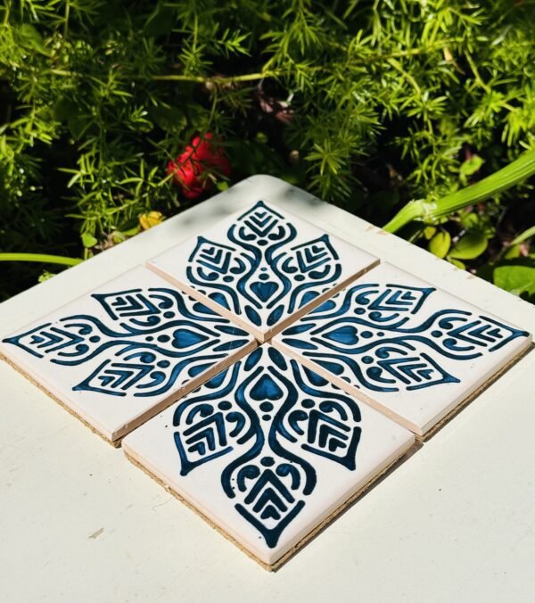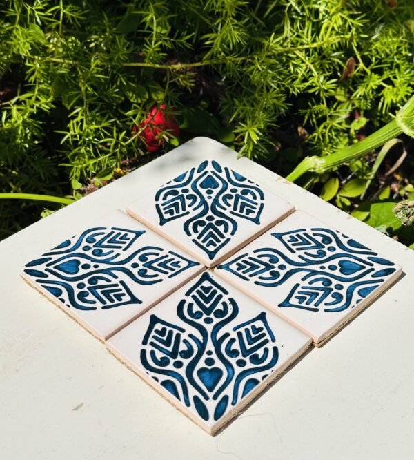 Bases de copos pintadas à mão em azulejo, revestidas com uma generosa camada de cortiça portuguesa. Vendido em pack de quatro unidades.