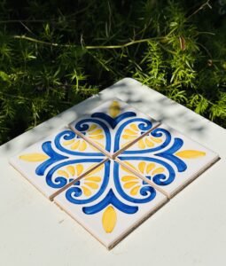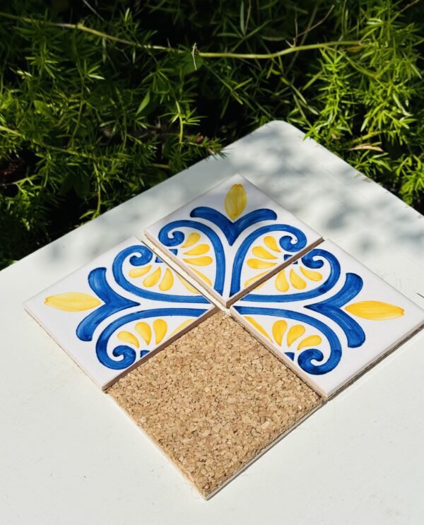 Bases de copos pintadas à mão em azulejo, revestidas com uma generosa camada de cortiça portuguesa. Vendido em pack de quatro unidades.