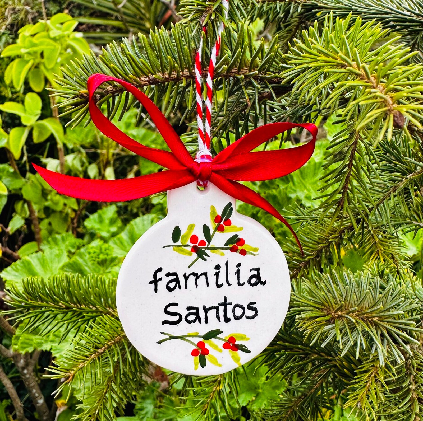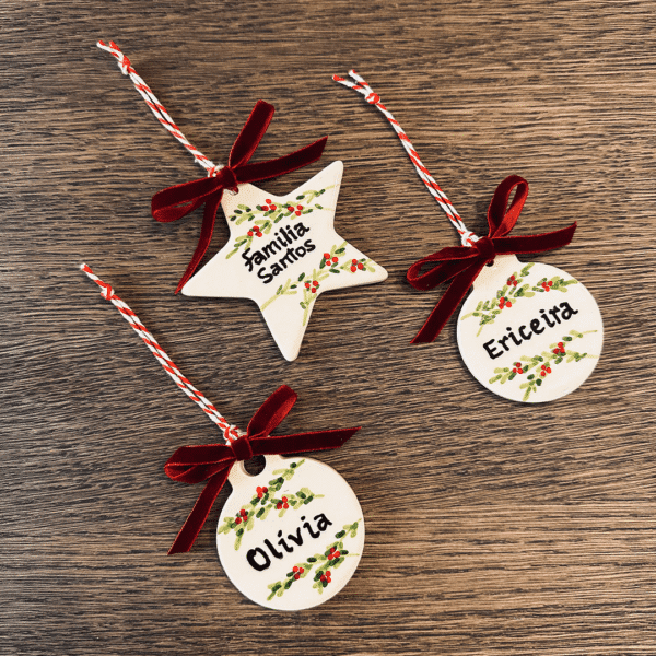 Bola Natal em cerâmica, moldada e pintada à mão com azevinhos. Uma peça única e artesanal, que pode ser personalizada com o nome da tua família, com nomes próprios ou até com o nome dos patudos lá de casa.