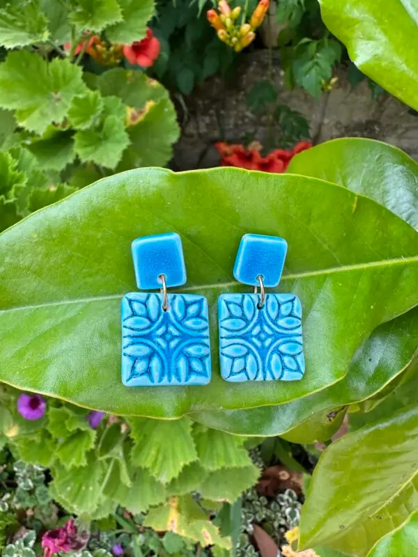 Peça moldada à mão em grés e decorado com vidrado turquesa. Alusivo aos tradicionais azulejos portugueses.