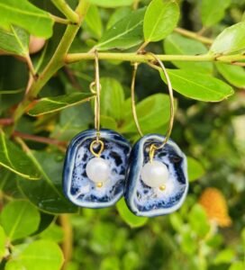 Brincos feito à mão em grés, decorados com vidrado reativo e pérolas. Cozidos a alta temperatura para garantir resistência e durabilidade.