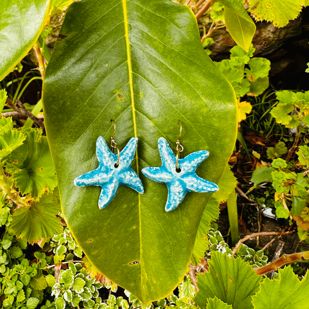 Brincos estrela do mar feitos manualmente em grés com vidrado turquesa.