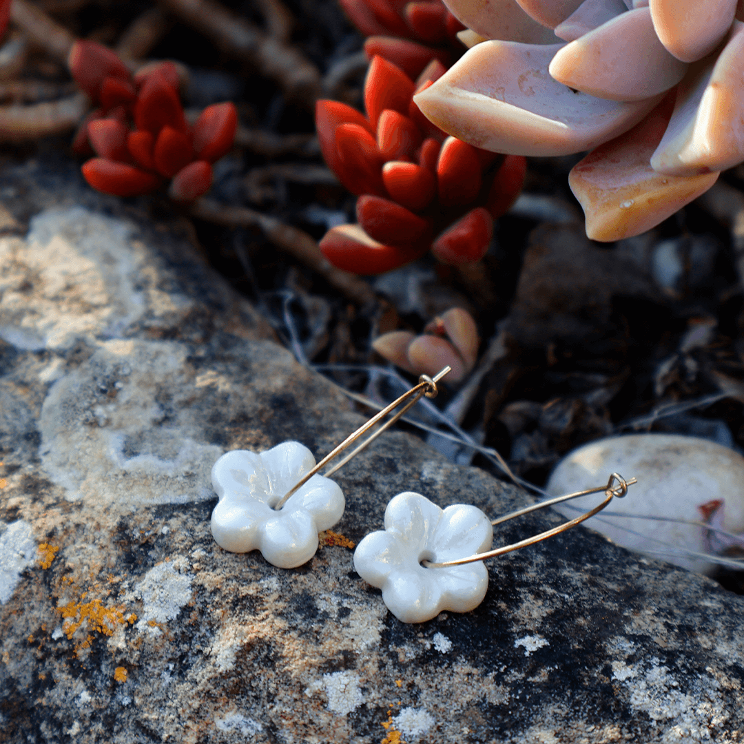 Brincos moldados à mão em porcelana com lustrina pérola. São uma peça única, cozidos a alta temperatura para garantir resistência e durabilidade.