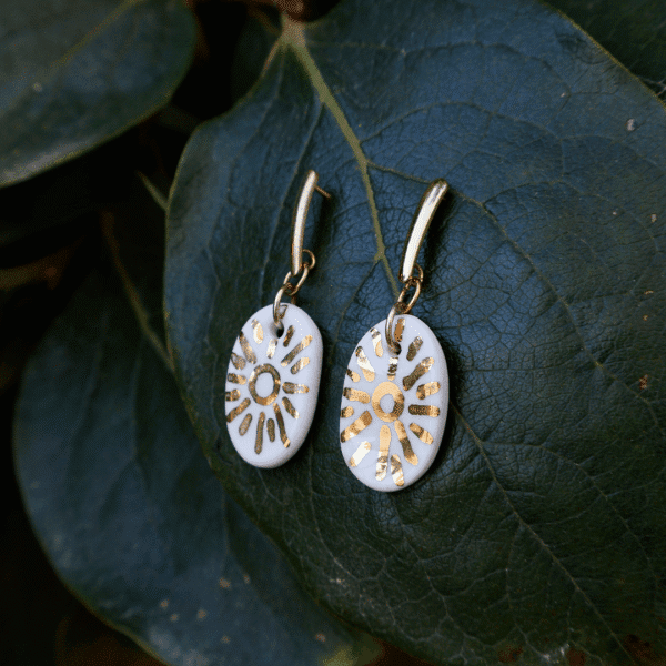Brincos feito à mão em porcelana com aplicação ouro líquido 10K.