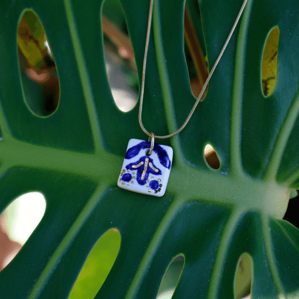 Colar em porcelana pintada à mão, cuidadosamente trabalhado com detalhes delicados em azul cobalto e fio de ouro 10K, tornando a peça irrepetível e sofisticada.