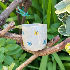 Copo de café moldado em grés e pintado à mão, com borboletas a voar pelo copo. Cada peça é única e faz parte da coleção ‘Do Pomar’.