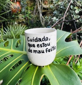 Copo de café moldado em grés e pintado à mão com a divertida frase “Cuidado que estou de mau feitio”. Uma peça única de cerâmica feita em Portugal.