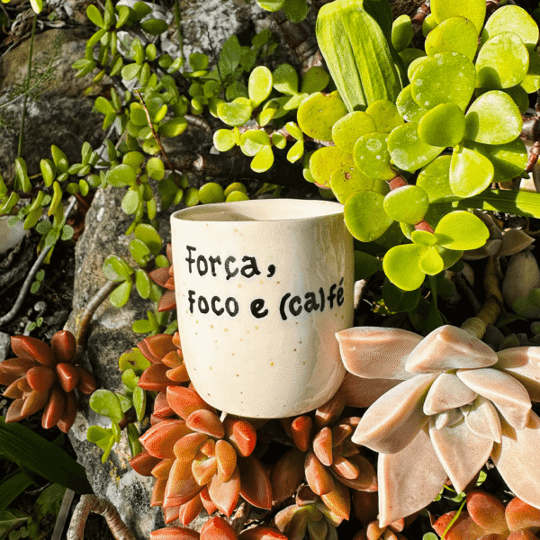 Copo de café moldado em grés e pintado à mão, com a frase ‘Força, Foco e (Ca)fé‘. Uma peça única de cerâmica feita em Portugal.