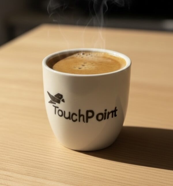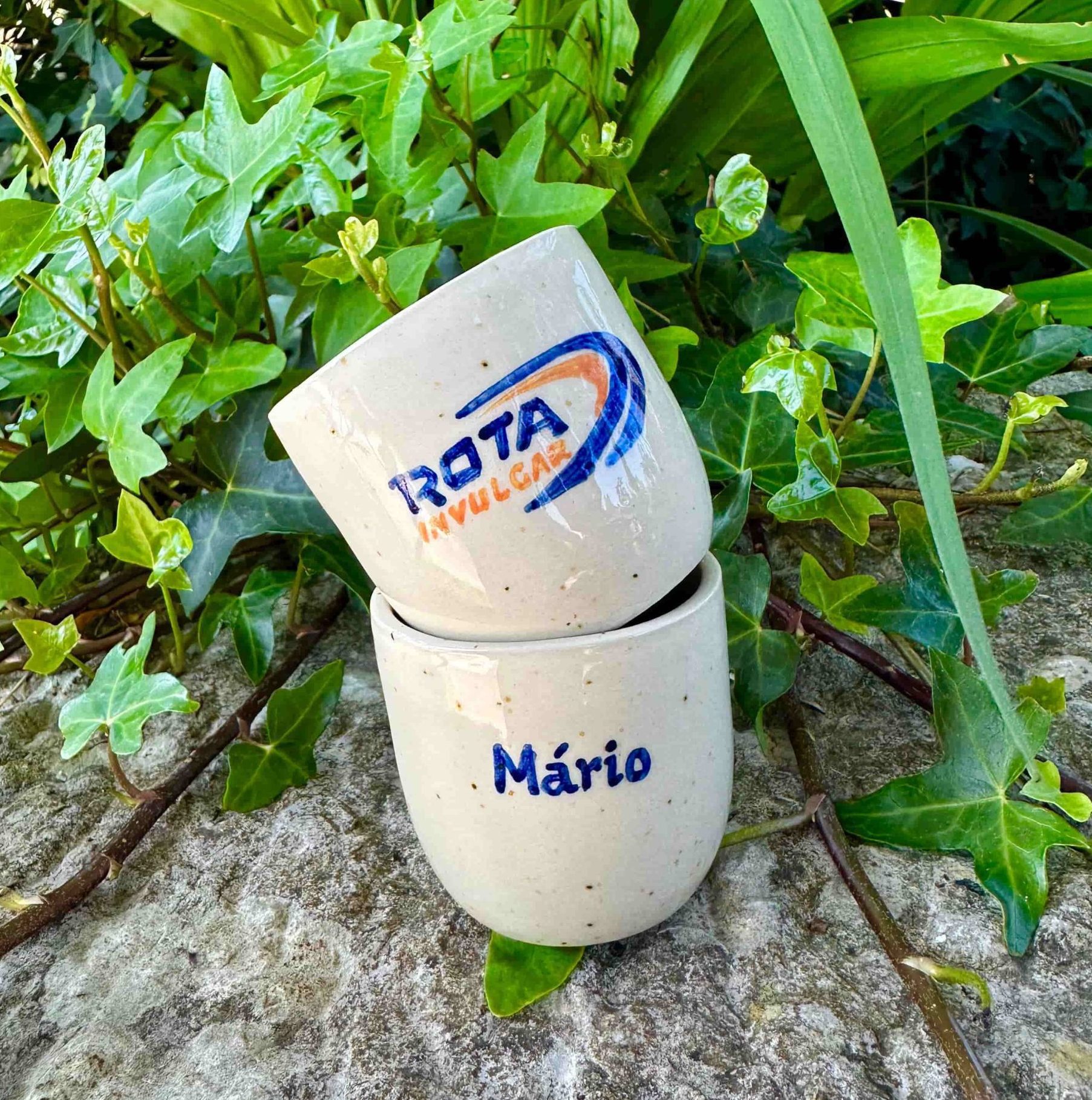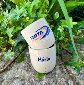 Copo de café moldado em grés e pintado à mão, totalmente personalizável com o logótipo da empresa e nome dos colaboradores/ clientes.