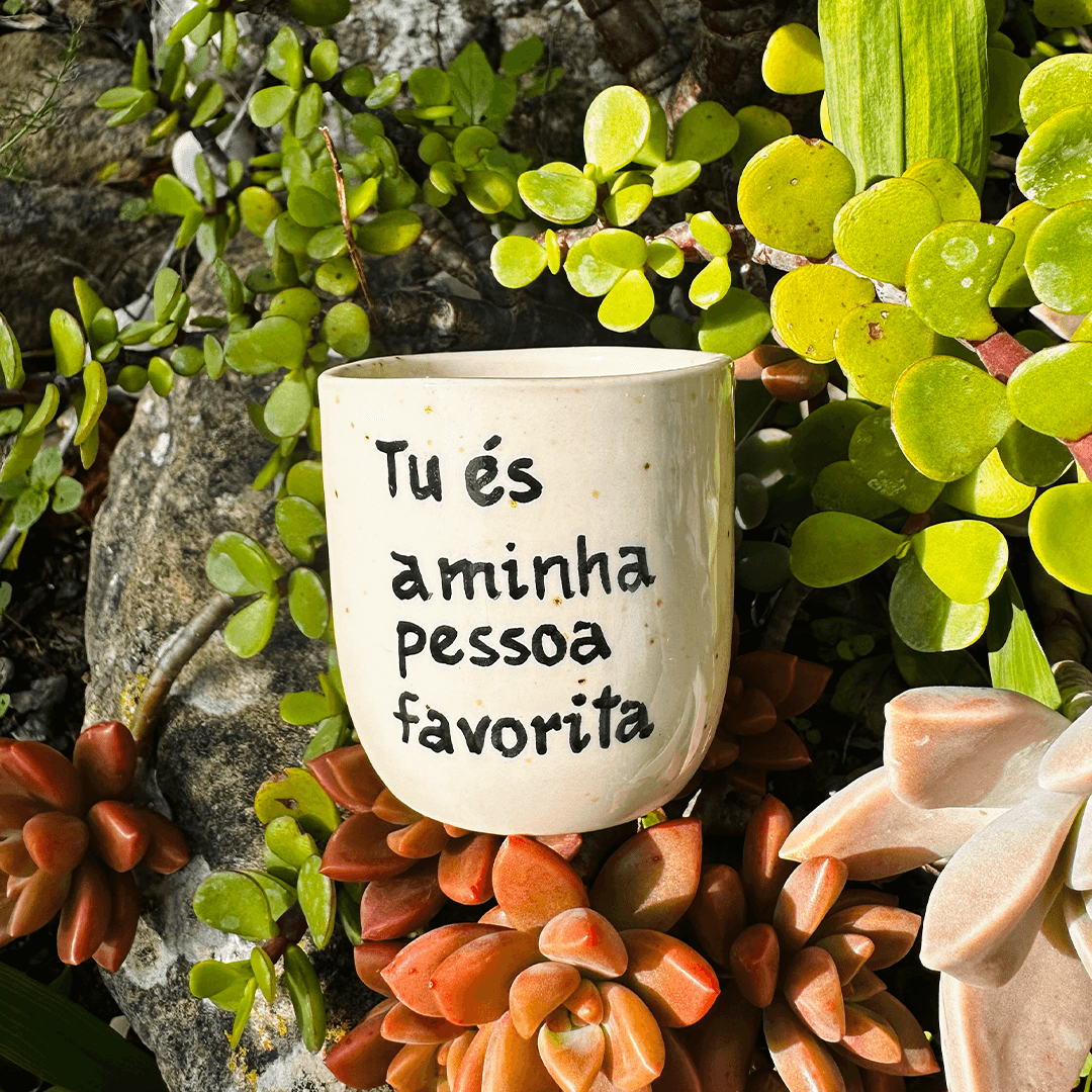 Copo de café moldado em grés e pintado à mão, com a frase ‘Tu és a minha pessoa favorita’. Uma peça única de cerâmica feita em Portugal.