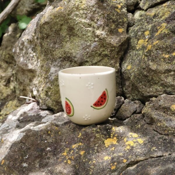 Copo de café moldado em grés e pintado à mão com melancias. Cada copo é único e integra a coleção ‘Do Pomar’.