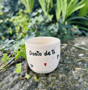 Copo de café moldado em grés e pintado à mão com a inscrição ‘Gosto de ti’ e corações distribuídos pelo copo. Cada peça é única, feita artesanalmente, perfeita para demonstrar carinho a alguém especial.