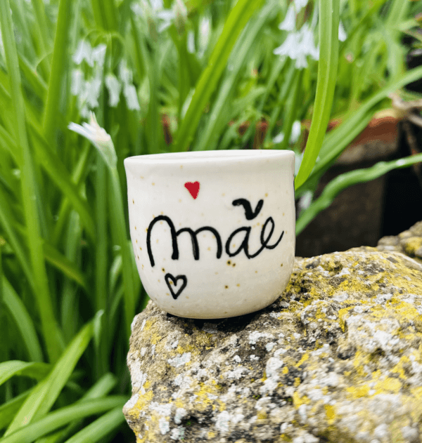 Copo de café moldado em grés e pintado à mão com a inscrição ‘Mãe’. Cada peça é única, feita artesanalmente, perfeita para celebrar o carinho de quem mais gostamos.