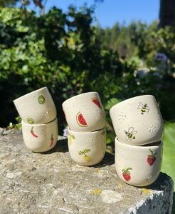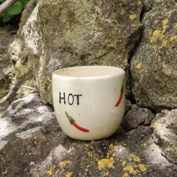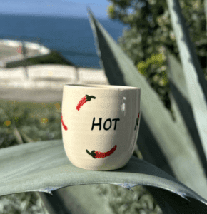 Copo de café moldado em grés e pintado à mão com malaguetas e a palavra ‘Hot’. Cada peça é única e faz parte da coleção ‘Do Pomar’.
