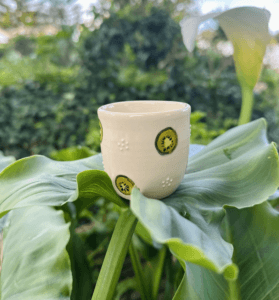 Copo de café moldado e grés e pintado à mão com quiwis. Cada peça é única e faz parte da coleção ‘Do Pomar’.