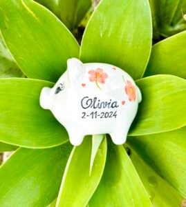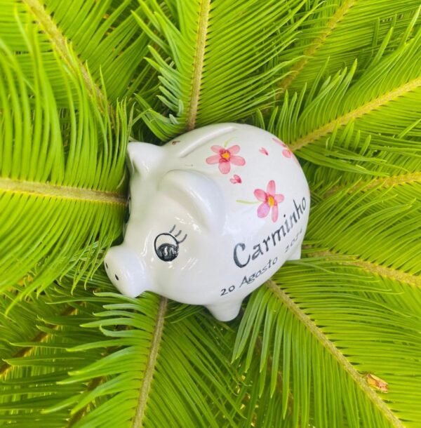 Mealheiro de cerâmica personalizado com o nome da criança e/ ou data de nascimento ou batismo, pintado à mão com abertura e tampa de silicone.