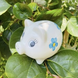 Mealheiro de cerâmica pintado à mão com abertura e tampa em silicone.