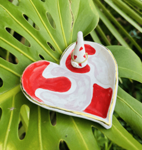 Peça única de autor feita em grés e pintada à mão com tintas de alto fogo e fio de ouro 10K.