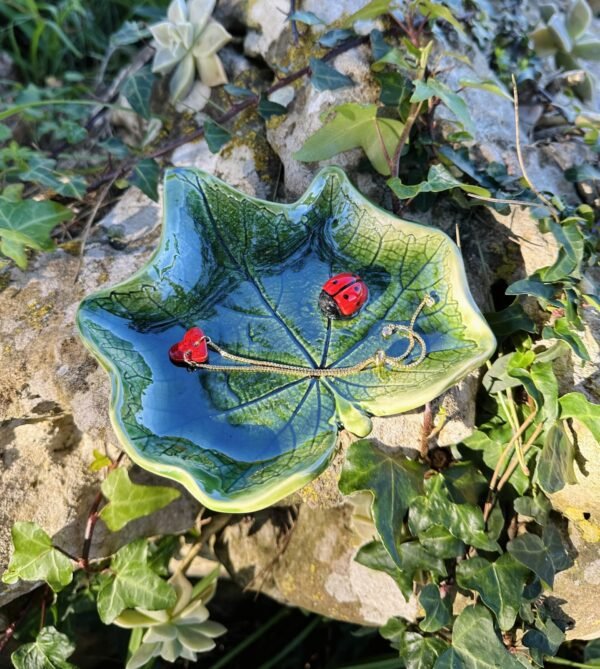 Porta jóias feito à mão em grés, com gravação de folha natural de sardinheira e joaninha pintada à mão.