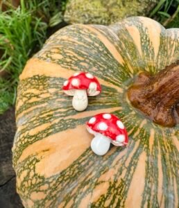 Pregadeira com cogumelo moldada manualmente em grés e pintada à mão.