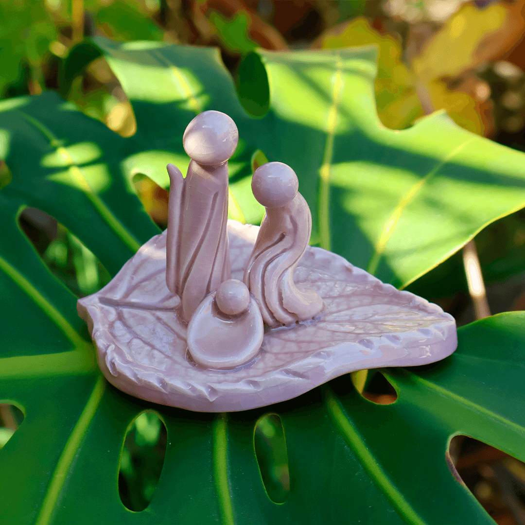 Presépio miniatura em cerâmica artesanal, feito à mão em grés com folha natural e tom nude.
